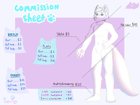 Hello there! Welcome to my commission page, my name potato or you can call me Zen. I'm a free lance artist that does mostly furries but i can also do humanoids as well.If you are interested in commissioning me then please check out the infos below :3